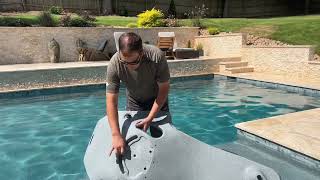 Step 2: Switch from holding front of Shayz and now lift the back of Shayz and watch and wait for the water to drain out of the holes behind the front riser snap-in location. At this point a majority of the water is drained from the core and Shayz can be lifted from the pool and placed in it normal seating position on the pool deck. While resting on the pool deck the core will fully drain and air circulates through the core. Expect water to drain onto the pool deck during this process.